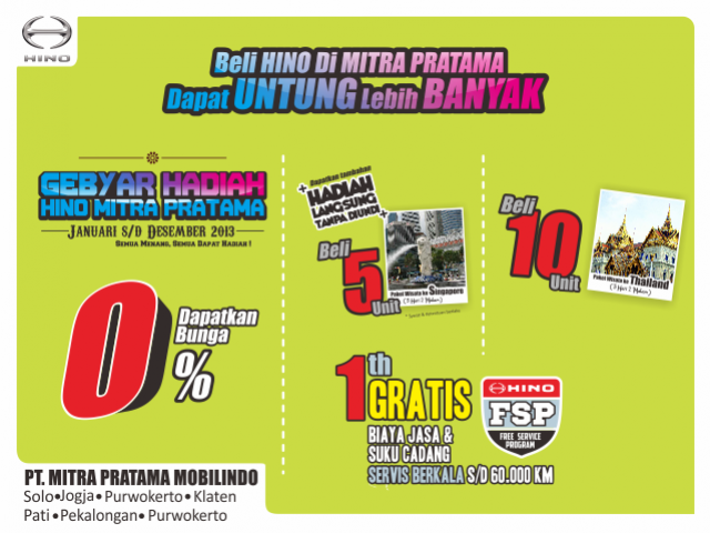 MITRA PRATAMA NEWS, Dalam rangka memberikan keuntungan kepada customer Hino, PT. Mitra Pratama Mobilindo Group memberikan keuntungan yang besar pada penjualan selama periode September - Desember 2013. Hal ini ditujukan untuk memberikan apresiasi kepada customer pengguna Hino. Program - program tersebut antara lain : Gebyar Hadiah Mitra Pratama 2013 Periode 2, Paket Wisata ke Singapura, Paket Wisata ke Thailand, Free Service Program (Program Servis dan Suku Cadang Gratis selama 1 Tahun), Bunga 0% untuk pembelian Hino Dutro melalui pembiayaan Mitsui Leasing, Adira Finance, Mandiri Tunas Finance, Indomobil Finance. Hadiah tersebut hanya bisa di dapatkan untuk pembelian Hino di PT. Mitra Pratama Mobilindo di Semua Cabang. (MPM Solo, MPM Jogja, MPM Purwokerto, MPM Klaten, MPM Pekalongan, MPM Pati)
